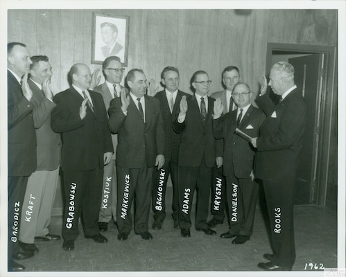 Description: Installation of new officers of the Hamtramck High School Alumni Varsity Club in 1962. They are (from left) Bruno Barodicz; Russ Kraft; Don Grabowski; Mike Kostiuk, sgt.-at-arms; Walter Markiewicz, president; Zig Bagnowski, vice president; Joe Adams, secretary; Joe Krystan; Walter Danielson, treasurer; and Arthur Rooks.