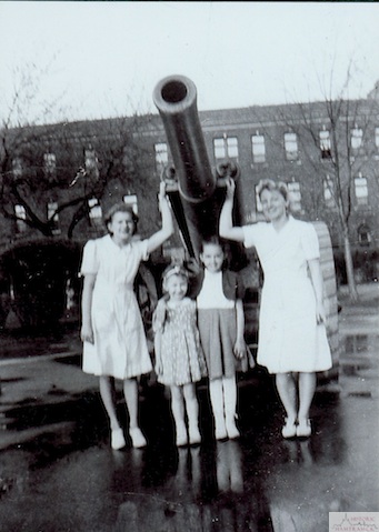 Description: The canon at Winfield (Zussman) Park before it was removed and melted down for the war effort. Martha Dobrzynski is at leftt. She was a nurse’s aid at St. Francis Hospital, in the background